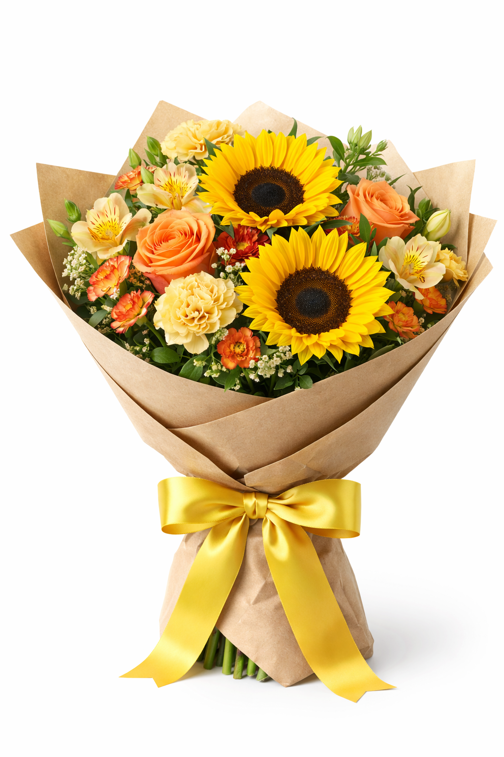 Ilumina cualquier ocasión con este hermoso bouquet lleno de energía y color. El arreglo combina vibrantes girasoles, elegantes rosas en tonos durazno, delicadas flores de acento y follajes frescos, cuidadosamente seleccionados para crear una composición armoniosa y alegre.